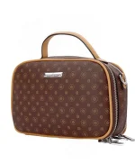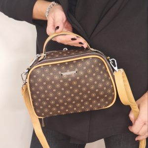 Τσαντά χιαστή καφέ λογότυπο και μπεζ λεπτομεριες.